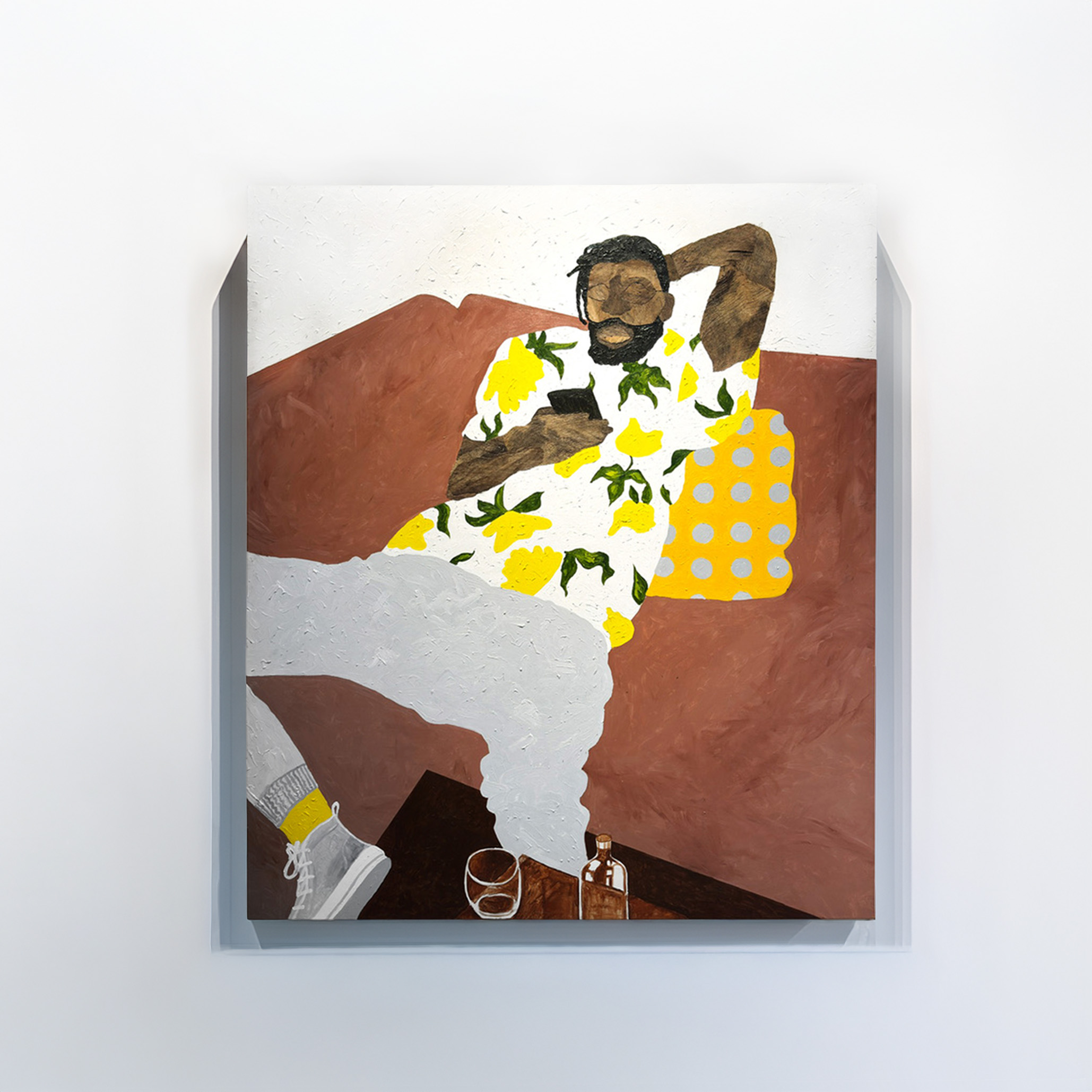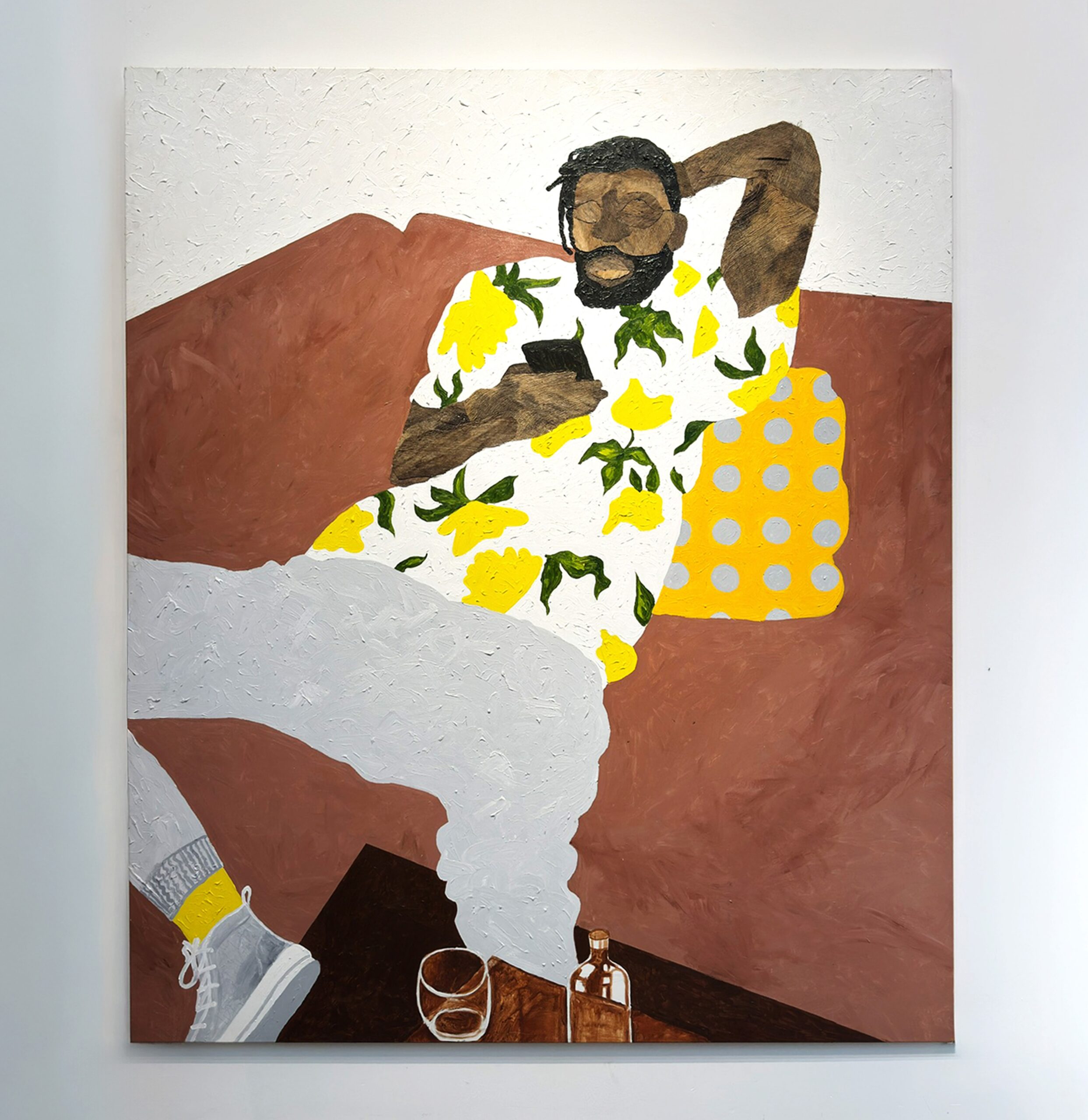 It was in the Cocoa Beach area, where he grew up, that his artistic relationship with the coconut began. Using coconut sheath to create the skin of the figures in his portraits he found a way to embody his own culture and ethnic identity into his practice. The coconut tree and fruit is now part of the artist’s daily visual experience. From a distance, the mixed media works of oil paint and coconut husk on canvas, appear as richly toned brown skin. The intrinsic properties of the coconut sheath’s multiple layers, longhairs, and varying shades of brown whimsically renders skin texture and bone structure, while emulating the way natural light surfaces on skin.